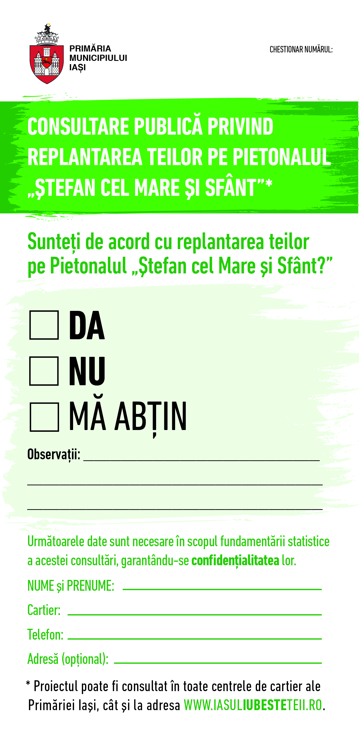 Ieșenii sunt invitați de municipalitate să își exprime opțiunea în legătură cu replantarea teilor pe pietonalul Ștefan cel Mare. Anunțul a fost făcut astăzi într-o conferință de presă de primarul interimar al Iașului, Mihai Chirica.